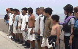 写真左から、基礎体力作りのランニング・休憩のひと時・スクール前・整列・海に入る前の点呼